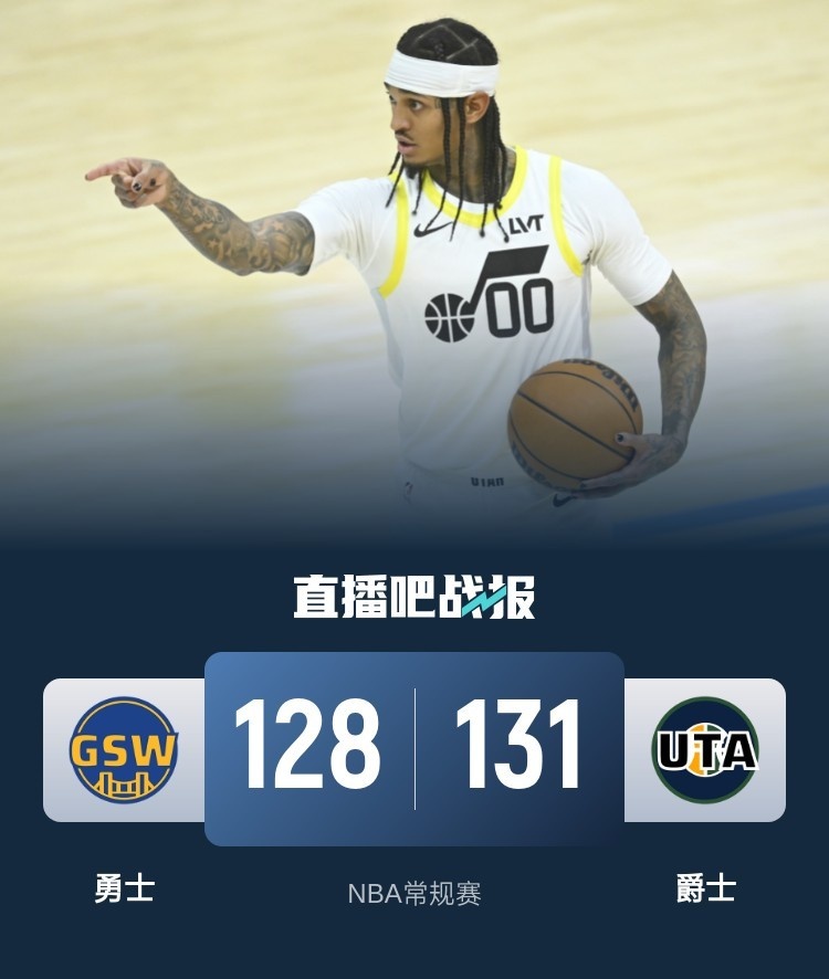 也许是受到临场大交易的影响,勇士首节开局打得非常被动并以8-18早早落后两位数;不过好在佩顿连拿关键4分稳住局面,随后波杰姆斯基末段连拿9分带队追至3分;次节双方对拼进攻势均力敌,不过勇士开局不久迅速反超控制局面,虽然优势并不大但勇士进攻端以五成的命中率守住2分领先进入下半场。下半场之争勇士一直保持微弱优势但一直无法拉开比分,这样局面几乎持续了整个下半场,不过关键时刻他们总能拿分,决胜时刻库里和希尔德相继命中三分带队取得11分领先,然而眼看着胜利在望的情况下勇士突然崩盘,爵士则连连打出反击,乔治最后命中反超三分,爵士轰出一波18-4的攻势完成大逆转。最终,爵士主场力克勇士拿下比赛。