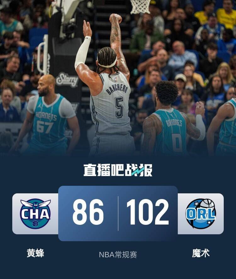 班凯罗24+8+6 小瓦格纳16+7 布里奇斯19+8 魔术赛季三杀黄蜂