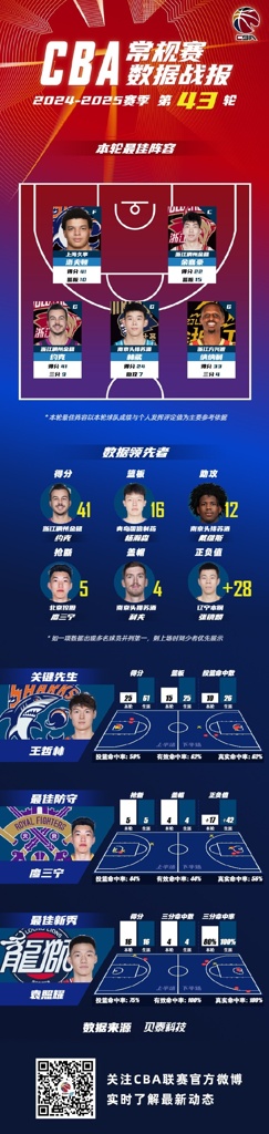 数据领先者方面:浙江稠州金租球员约克以单场41分的数据领衔得分榜;