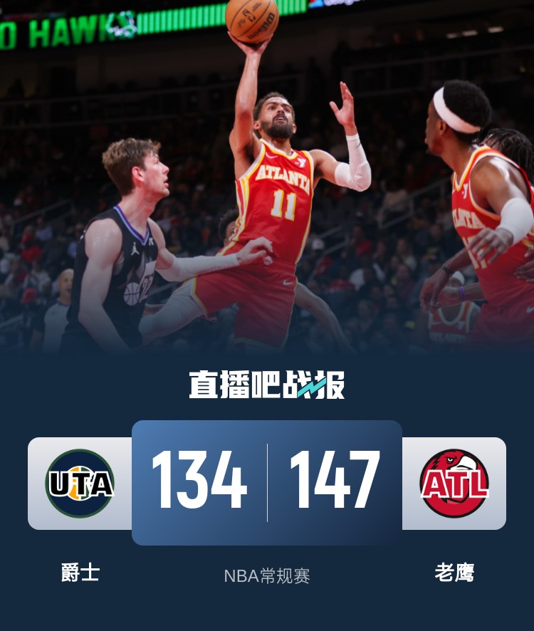 比赛开始,老鹰就捍卫主场打出不错开局,塞克斯顿联手乔治带领爵士追分,但奥孔武连续内线打成迅速得分上双回应,老鹰单节轰出41分领先13分,次节乔治连续三分带队追至个位数分差,克雷伊奇连续3记三分9-0回应再次拉开比分,随后老鹰再打8-0一度拉开20分以上领先。下半场,双方继续对攻战,科利尔接连突破助队追分,但老鹰多点开花始终回应保持住十几分领先,末节双方还是围绕着双位数分差拉锯战,乔治里突外投继续追分,特雷-杨继续串联球队,奥孔武内线还能回应,最终老鹰147-134击退爵士,终止3连败同时送对手9连败。