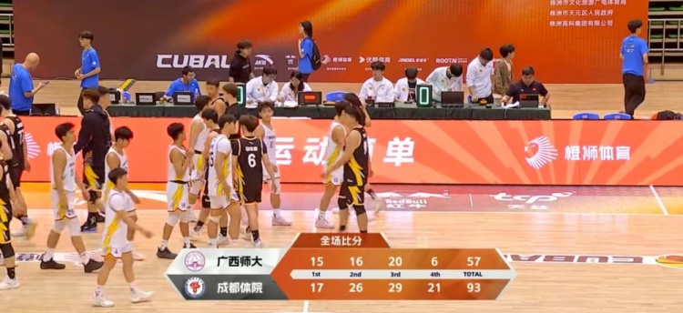 末节比赛,广西师大的表现更加糟糕,进攻更是直接断电,前九分钟的时间里只拿到2分,单节只拿到6分,成都体院继续将分差扩大到三十分以上,比赛彻底失去悬念,最终成都体院93-57大胜广西师大成功晋级。