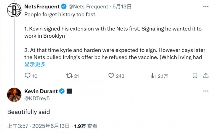 6月16日讯 近日,有篮网自媒体在社媒上总结了杜兰特离开篮网的过程。他写道:“人们遗忘历史的速度太快了。 ”