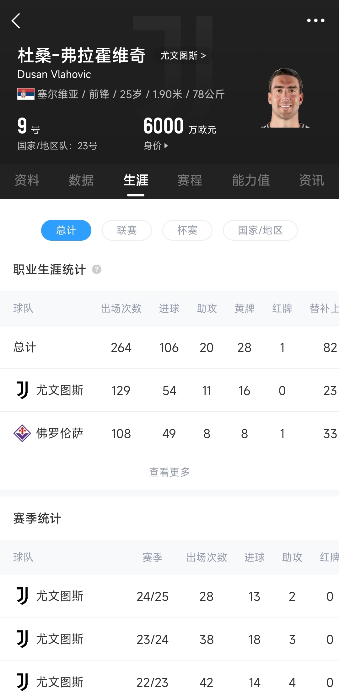2022年冬窗,尤文以8350万欧元的转会费从佛罗伦萨签下弗拉霍维奇,迄今弗拉霍维奇代表尤文出战129场比赛,贡献54球11助。目前弗拉霍维奇在尤文的税后年薪为1200万欧元,高居队内薪资榜首(第二的布雷默500万欧元)。
