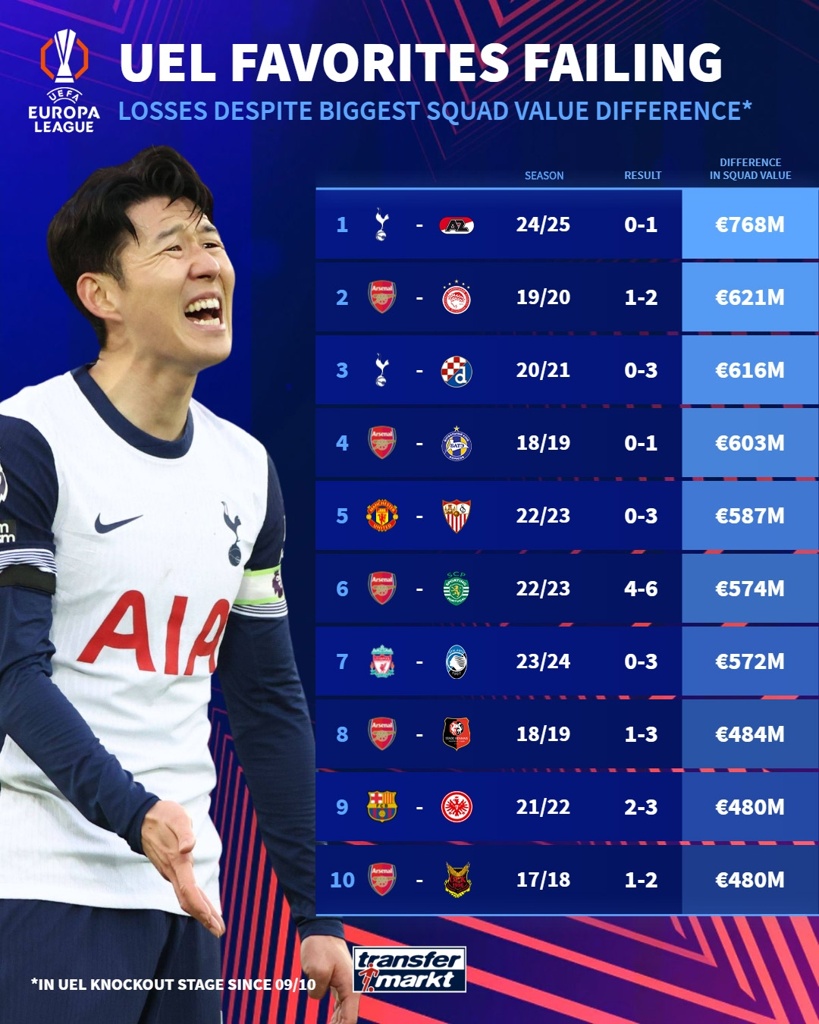 据德转统计,两队阵容身价差达到7.68亿欧,创造了一项尴尬纪录——欧联输球的最大身价差。