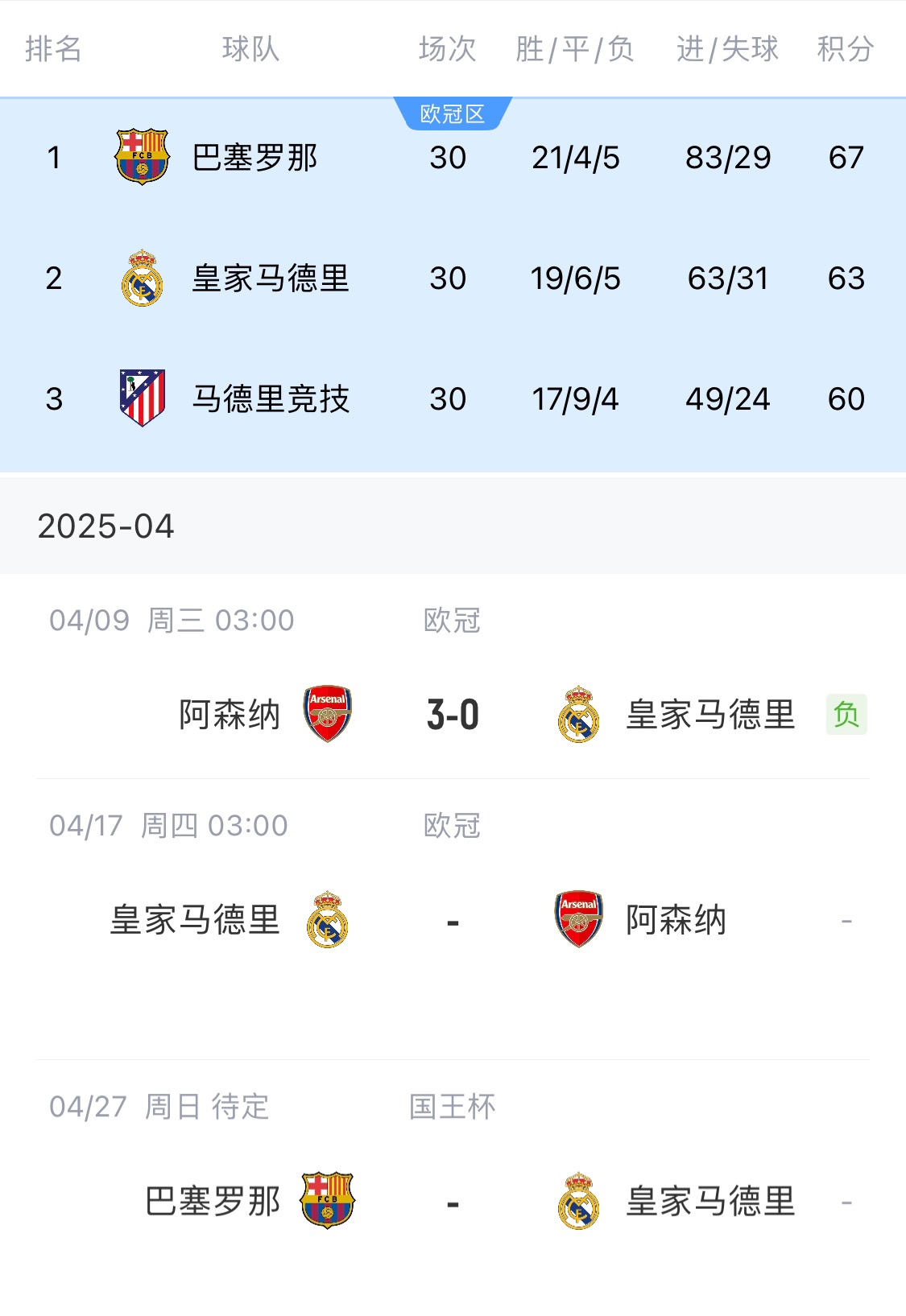 目前皇马西甲落后巴萨4分,欧冠1/4决赛首回合0-3落败,国王杯决赛将对阵巴萨。