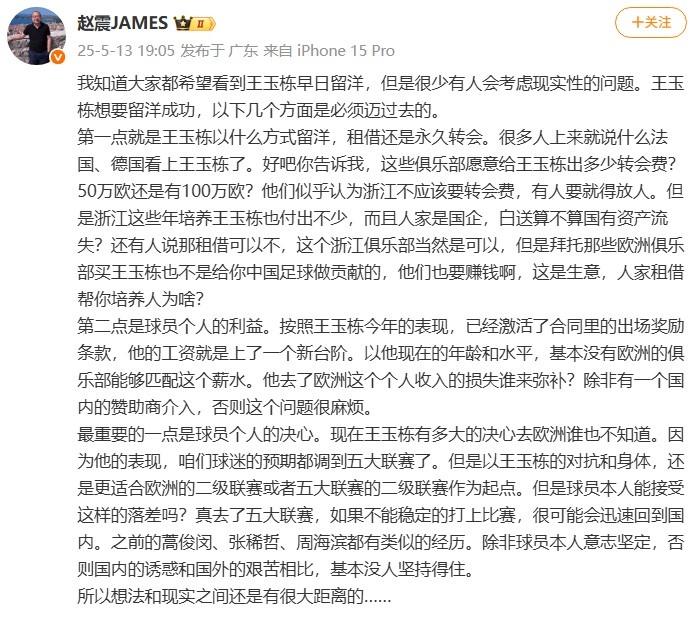 5月13日讯 关于多家来自德国、法国的俱乐部想要签王钰栋的话题,媒体人赵震给出了他的分析。