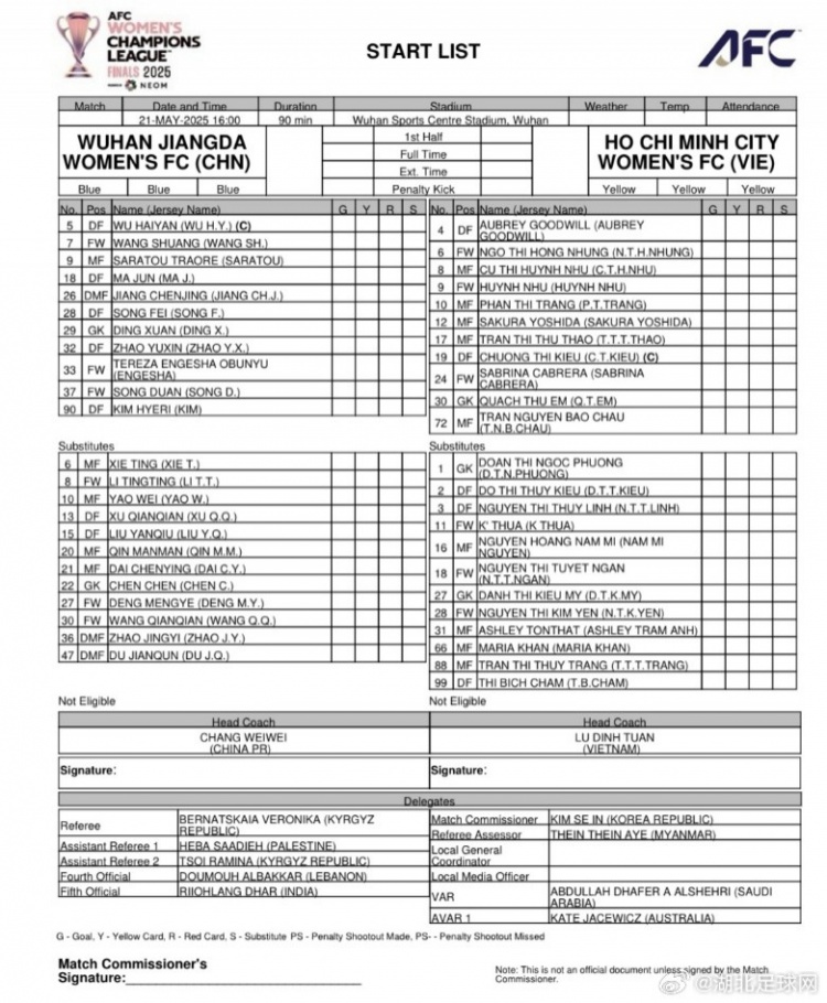 5月21日讯 今天下午16时,女足亚冠联赛半决赛武汉女足与胡志明女足的比赛将在武汉打响。目前双方首发已经公布,王霜、吴海燕以及新援特雷莎领衔武汉女足首发。
